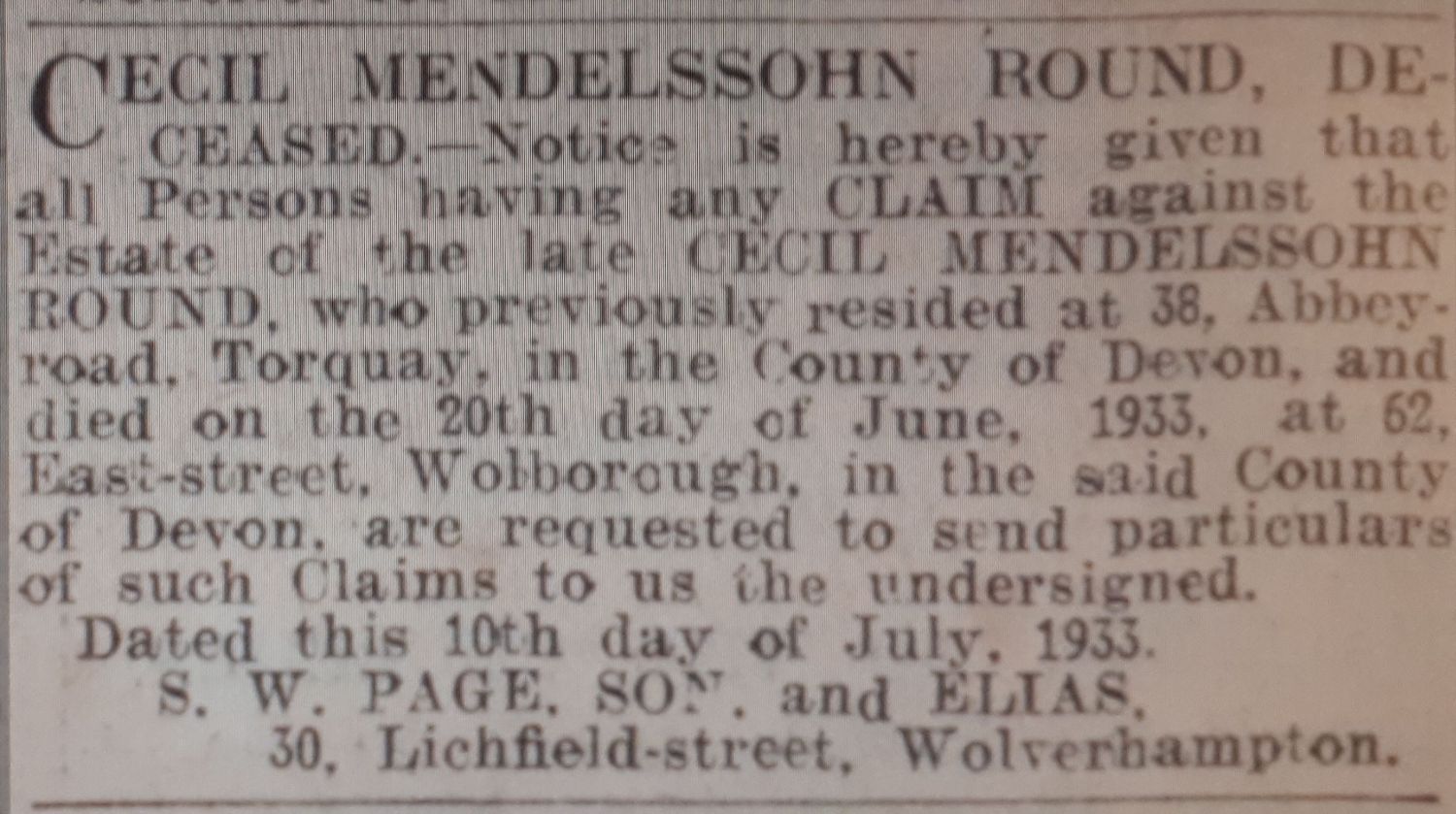 Following the death of Cecil Round in June 1933, we find ‘between the sheets’ of the Western Morning News of 12 July 1933, a formal notice for any Persons having a claim against the Estate of the late Cecil Mendelssohn Round, to come forward to S. W. Page, Son and Elias of Wolverhampton. The advert includes details about where Cecil Round had resided prior to his death, along with the address where he sadly passed away.