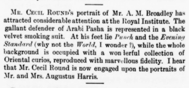 “No such complaint could be made against the ‘Musical afternoon,’ given on Tuesday, by Mr A. Broadley, the famous Counsel, who defended Arabi Pasha. His pretty rooms are decorated with all manner of Eastern curiosities, including many relics of Arabi, gifts from the Kasre decorated with and portraits of crowds of distinguished people (poor Fred Burnaby amongst them) hanging on the walls, and a capital portrait of the host by Cecil Round standing on an easel, being not quite finished.